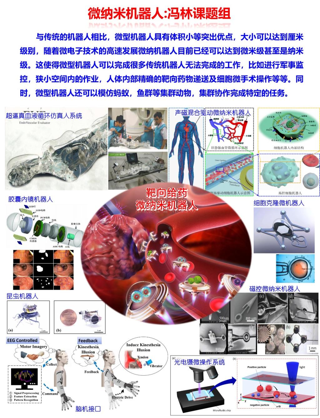 冯林,教育部国家级领军人才青年项目获得者、北京市杰出青年、北京市科技新星、JSPS学者、GCOE学者、高被引学者、主要研究方向为微纳操作和微纳米机器人。获得国家重点研发计划,智能机器人专项“靶向药物输送场控微纳米机器人精准化技术与医用基础研究”项目,以及国家重点研发计划“颠覆式技术”,“基于高敏感性光电薄膜的光电镊单细胞无损自动化筛选设备”项目等国家级省部级项目20多项。获得机器人领域顶级会议IEEE ICRA在内的最佳论文奖等10项。带领学生获得全国大学生“互联网+”大赛金奖全国第二、首都挑战杯特等奖、冯如杯一等奖20多项。发表学术论文140篇,封面文章10篇。出版《微纳米机器人概论》教材一部、英文专著4部。研究主要集中在场控微纳载药机器人,建立靶向药物输送微纳机器人一体化制造与多场驱动技术体系,为新一代微纳米机器人制备及控制提供理论及方法支持。细胞生物学、生物制造以及再生医疗等领域中,细胞组织级的精密操作显得极为重要,比如克隆、体外受精、人工诱导多能干细胞生长成型等。传统的细胞操纵方法大多采用体积庞大的微操作机械臂,其精度低、可重复性低、价格昂贵、效率低下。因此为了解决这一几十年不变的陈旧技术,我们设计开发出了新型磁控微型机器人,应用于单细胞操作。其具有精度高、控制简单、可重复性高等优势。该微型机器人由磁性材料加工而成,封装于微流控芯片中,通过利用外界磁场的自动化控制,可以有效避免外界环境对细胞的侵染,并极大的提高了操作控制精度。 ___·主持项目与课题·__________________________________________________________ 主持或参加的主要科研项目(按时间顺序倒排) 1. 国家重点研发计划“首批颠覆式技术”,“基于高敏感性光电薄膜的光电镊单细胞无损自动化筛选设备”2022年-2024年,500万,项目主持; 2. 国家重点研发计划,“靶向药物输送场控微纳机器人基础研究”2020年,453万,课题一主持 3. 教育部国家级领军人才青年项目“医用微纳米机器人与微纳操作”; 4. 北京市杰出青年基金“靶向给药微纳米机器人系统”100万 项目主持; 5. 北京市科技新星项目 靶向给药场控微纳米机器人技术 2019.11-2021.11,50万,主持; 6. 胶囊机器人系统研究,2019年-2023年,横向课题,50万; 7. 光电操作设备中核心光电薄膜的研制,2020年-2021年,横向课题,100万; 8. 2019-nCoV快速诊断技术与互联网+AI预防控制体系, 子课题负责人 100万; 9. “JCJQ计划”重点基础研究项目(GF973计划),2019-JCJQ-ZD-120-00,基于植入式芯片与光电**脊髓功能重塑技术研究,2019-12至2022-12,1200万在研,参与; 10. 北京市自然基金针对细胞级微纳米机器人系统研究,2017.10-2020.6 28万; 11. 科技委仿生悬停平台器件研究及演示验证,2017.7-2018.6 750万; 12. 科技委仿生智能变色光子晶体纳驱动,2017.8-2019.7 100万; 13. 青年拔尖人才计划,2018-2021,100万; 14. 卓越百人,2016.10-2017.12,50万; 15. 仿生多级结构多场效应创新团队,2017.8-2018.7 ,100万 ; 16. 基础研究文部科学省Challenge of On-chip Precise Enucleation of Oocyte Using 3D 6DOF Manipulation 2013.4-2015.3 4,030,000日元; 17. 基础研究文部科学省 Autonomous induction monitoring and cell measurement by ultra-high-speed operation 2013.4-2014.3 122,720,000日元; 18. Nagoya Univ. GCOE High Speed Enucleation of Oocyte Using Magnetically Actuated Microrobot on a Chip 2013.4-2014.3,1,000,000日元; 19. 日本科技振兴会 Automatic oocyte enucleation manipulation 2011.4-2013.3 2,000,000日元; 20. 日本基础研究文部科学省 Evaluation and dynamic measurement of biomembrane transporter using on-chip 2008.4-2010.3 49,790,000日元; ___·学术期刊·_______________________________________________________________ [109] Zhang, Liwen, Song Zhao, Xinzhao Zhou, Xueshan Jing, Yu Zhou, Yan Wang, Yantong Zhu et al. "A Magnetic-Driven Multi-Motion Robot with Position/Orientation Sensing Capability." Research. [108] Gao, Chao, De Gong, Xue Deng, Lin Feng, and Wenqiang Zhang. "Vision-based method for precise manipulation of magnetic spiral microrobots." In 2022 IEEE International Conference on Cyborg and Bionic Systems (CBS), pp. 92-96. IEEE, 2023. [107] Wang, Luyao, Han Gao, Hongyan Sun, Yiming Ji, Li Song, Lina Jia, Chutian Wang et al. "Reconfigurable Vortex-like Paramagnetic Nanoparticle Swarm with Upstream Motility and High Body-length Ratio Velocity." Research 6 (2023): 0088. [106] Hou, Yaxin, Yuguo Dai, Wei Zhang, Minghui Wang, Hanxue Zhao, and Lin Feng. "Ultrasound-Based Real-Time Imaging of Hydrogel-Based Millirobots with Volume Change Capability." Micromachines 14, no. 2 (2023): 422. [105] Gan, Chunyuan, Jiaying Zhang, Jiawei Zhao, Shuzhang Liang, Yiming Ji, and Lin Feng. "Cell Focusing and Rotation by a Planar Optoelectronic Tweezers." In 2022 International Conference on Manipulation, Automation and Robotics at Small Scales (MARSS), pp. 1-5. IEEE, 2022. [104] Ji, Yiming, Xue Bai, Hongyan Sun, Luyao Wang, Junjie Xu, Chunyuan Gan, Yuguo Dai, Hui Hui, and Lin Feng. "Biocompatible Ferrofluid Robot With Photothermal Property for Targeted Tumor Therapy." IEEE Robotics and Automation Letters 7, no. 4 (2022): 11517-11522. [103] Xu, Minghao, Shuzhang Liang, Wenqiang Zhang, Lin Feng, Kehan Chen, Xue Deng, Deyuan Zhang, and Jun Cai. "Biomimetic color‐changing skin based on temperature‐responsive hydrogel microspheres with the photonic crystal structure." Journal of Polymer Science 61, no. 1 (2023): 100-107. [102] Tang, Tan, Peipei Zhang, Yanran Wei, Hongxing Jia, Lin Feng, and Ye Xu. "High-efficiency 3D cell spheroid formation via the inertial focusing effect in rotating droplets