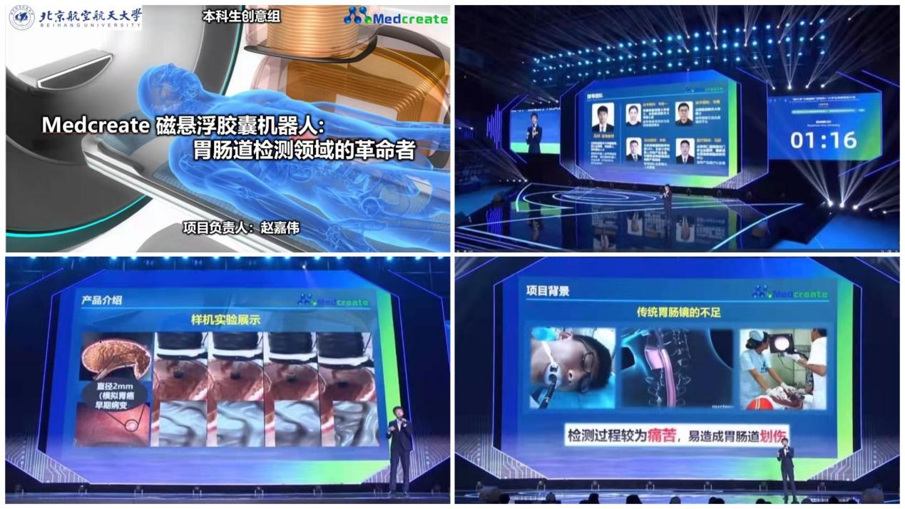 10月12日至15日,由教育部等12个中央部委单位和江西省人民政府共同主办,南昌大学、南昌市人民政府承办的第七届中国国际“互联网+”大学生创新创业大赛总决赛在南昌大学举行,我院选送的“Medcreate磁悬浮胶囊机器人:胃肠道检测领域的革命者”(指导教师:冯林副教授,主要完成人:2018级机械学院本科生王新阳、赵嘉伟等)在入围总决赛的1085个项目中脱颖而出,获得高教主赛道金奖,并以小组第一的成绩入围本科生赛道三强赛,获得全国第五的好成绩。继2020年12月获得全国挑战杯创业大赛金奖、2021年7月北航机器人队获得全国机器人大赛季军之后,学院学子再获全国奖殊荣。