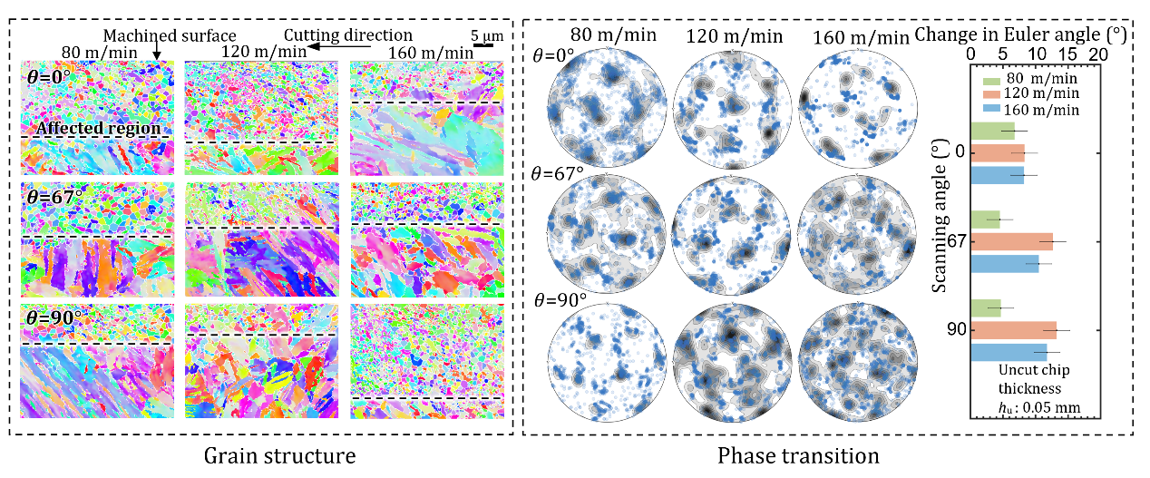 随着人形机器人、新能源汽车等行业对齿轮轻量化和功率密度的需求持续提升,金属增减材协同制造成为高性能齿轮制造的研究前沿热点,可实现复杂拓扑结构的轻量化齿轮高效成形。然而,增材过程引入的组织非均匀性对后续精加工过程造成了质量挑战,尤其是针对典型齿轮车齿、滚齿法中普遍存在的负前角加工机制,存在齿面表面微观结构及亚表面加工完整性演化机制不明的问题。由此研究团队针对激光粉末床熔融制成的17-4PH热处理不锈钢开展了极端负前角切削机理研究。聚焦近表面材料组织变形变性机理,阐明极端切削条件下打印齿轮表面及亚表面的晶粒精炼及相变机制,揭示了微观晶相结构变形与马氏体相变在表面强化中的关键作用,深入剖析了不同打印织构在负前角加工条件下的组织响应特点。