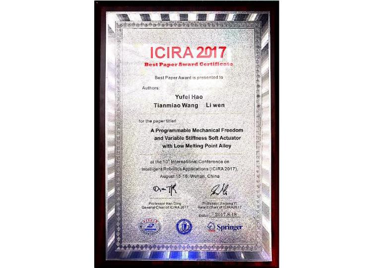 2017年第十届智能机器人与应用国际会议(The 10th International Conference on Intelligent Robotics and Applications)与8月15-18日在武汉召开。本次会议中我院iTR中心软体机器人实验室投稿的题为《A Programmable Mechanical Freedom and Variable Stiffness Soft Actuator with Low Melting Point Alloy》的论文获得大会最佳论文奖(Best Paper Award)。本届会议由国家自然科学基金委员会和华中科技大学联合主办,围绕软体与仿生机器人、水下机器人、虚拟现实与人工智能等14个专业方向,开展了48个分论坛,大会共发表论文355篇。