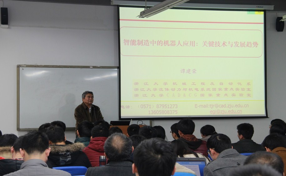 谭建荣院士是我国的著名机械工程专家,主要从事机械设计及理论、计算机辅助设计与图形学、数字化设计与制造等领域的研究。谭院士在报告中详细介绍了机器人技术与信息技术融合的发展趋势,表示物联网、虚拟现实、模式识别、智能传感技术等与机器人技术的融合将进一步推动机器人的发展与应用。结合美国的《先进制造业国家战略计划》、德国的“工业4.0”,谭院士向师生介绍了《中国制造2025》战略纲要,指出数字化制造、网络化制造和智能化制造是其三大核心。之后,谭院士向师生们介绍了机器人应用技术的发展趋势,并结合工程实际讲解了机器人生产线布局设计与作业规划、机器人运动学动力学性能分析、机器人任务虚拟示教与模拟仿真、机器人自动化生产线与集成等相关技术。