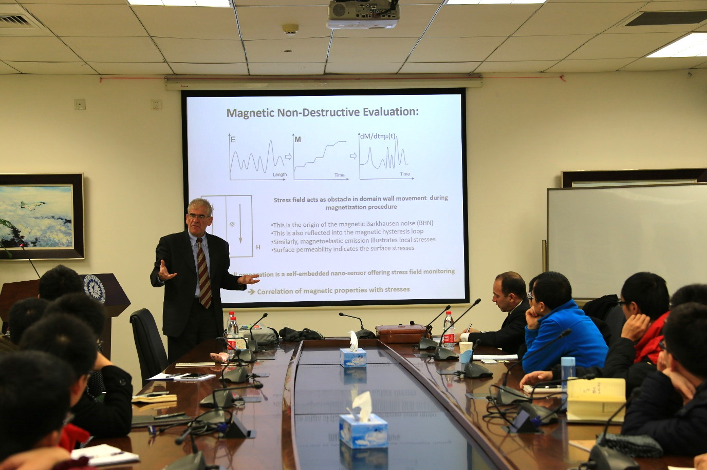 2015年11月25日上午10:30希腊国立雅典理工大学Evangelos V Hristoforou教授在新主楼A849会议室做了题为“Novel magnetic techniques to monitor the stress distribution in steels”的学术报告,介绍了利用磁场特性测量铁基材料中三维内应力技术的基本原理、传感器设计与工业应用。