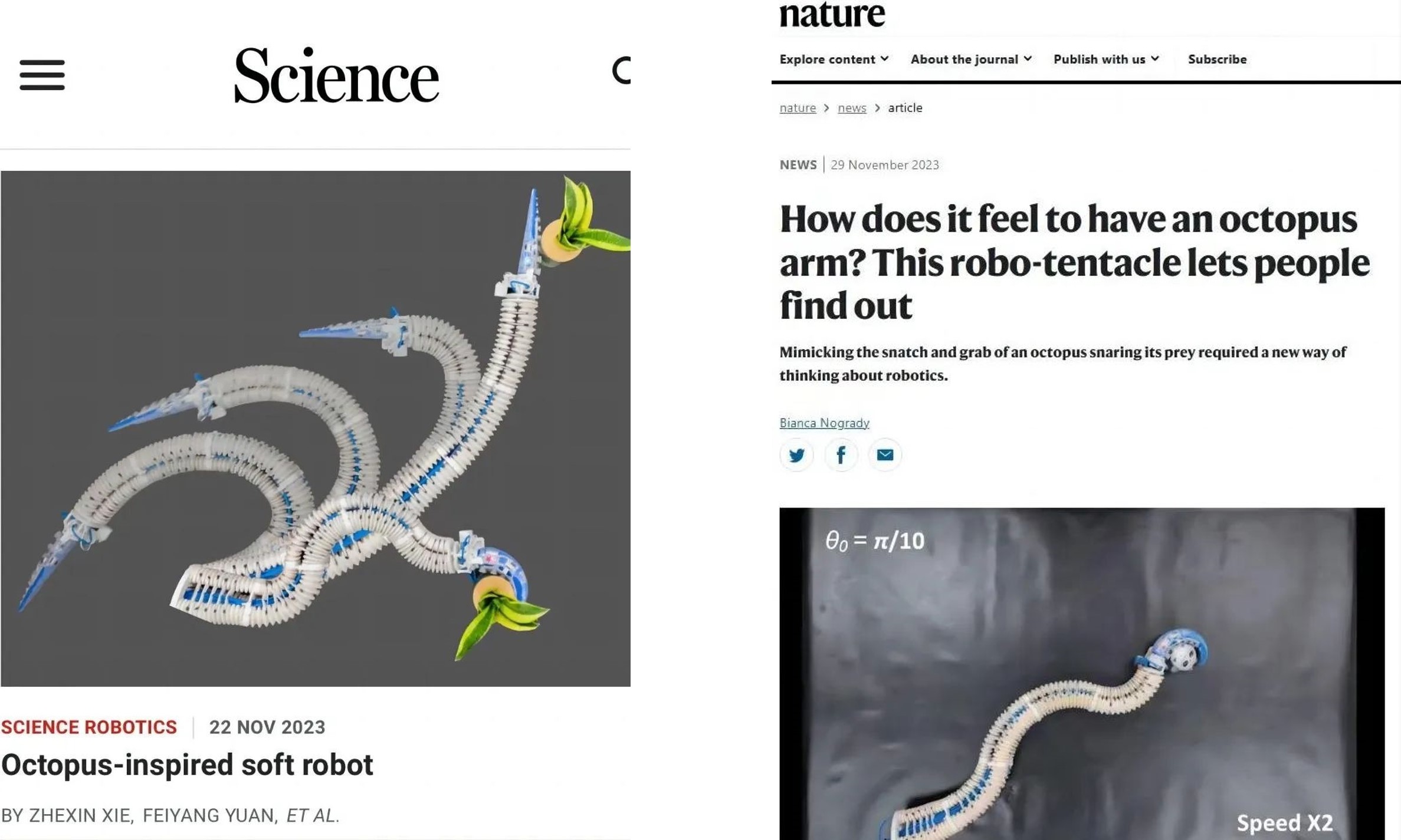早在2015年,文力课题组就开启了关于仿生章鱼臂的研究。起初,他们将目光聚焦于章鱼臂的末端部分,就“章鱼触手如何吸附、如何抓取”这个问题一探究竟,发现触手末端必须有一定的锥度才能“手到擒来”。而在大范围、大空间的应用场景中,仅靠触手末端是远远不够的。为了使机械臂可以真的像章鱼一般“心灵手巧”,团队开展了更进一步的研究。