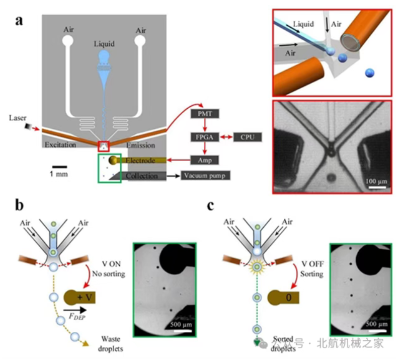 单细胞是人体组织器官的基本构成单元,针对传统生物打印技术不能稳定可控打印单细胞的技术瓶颈,提出了微流控分选打印单细胞概念(图2),发明了气流中的单细胞介电泳分选技术,在毫米级微流控芯片上实现打印头的设计制造,相较于传统打印技术大幅度提高了单细胞打印位置精度和打印速度,打印精度达到10 μm,打印速度达到100 Hz。