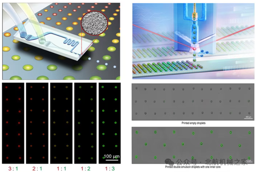 针对传统液滴微流控打印精度低、材料单一等问题,提出以超疏水限域液滴喷射方法,进一步提升了液滴打印精度,实现了目前微流控液滴打印的最高精度3 μm;提出微流控芯片流道浸润图案化工艺,实现微流控打印头内的多级乳液可控生成,通过实时检测与介电泳分选实现了空气中的多材料乳液液滴按需分选打印(图1)。